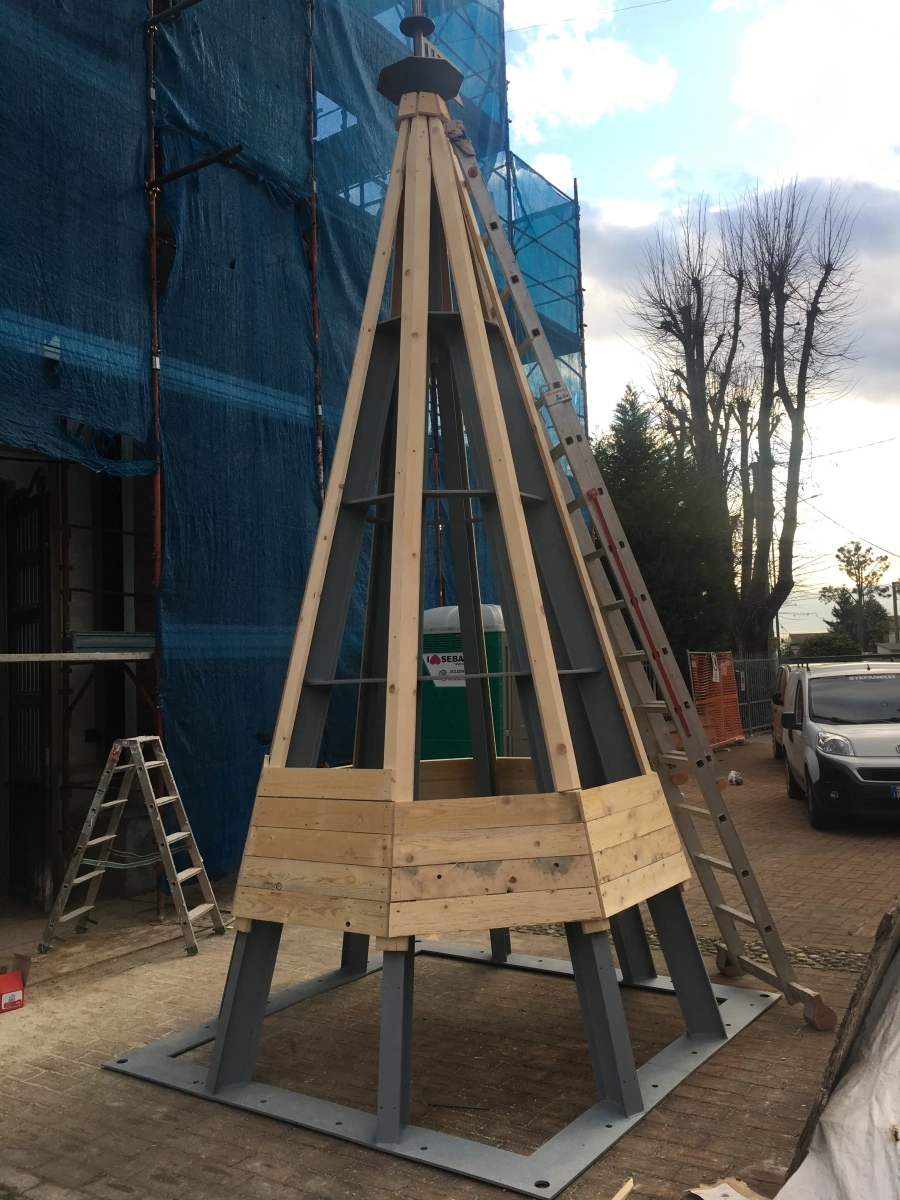 Il lavoro ha richiesto un’attenta fase di progettazione e una realizzazione artigianale di altissimo livello: a partire dalle misure rilevate, è stato elaborato un progetto geometrico complesso, composto da 8 triangoli (per formare una figura ottagonale) di circa 4 metri ciascuno, che costituivano la cuspide, e da una base sottostante composta da 8 pezzi da 1 metro.